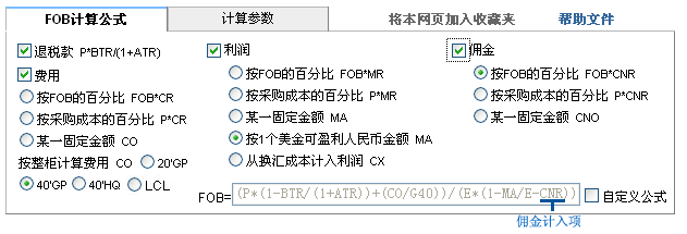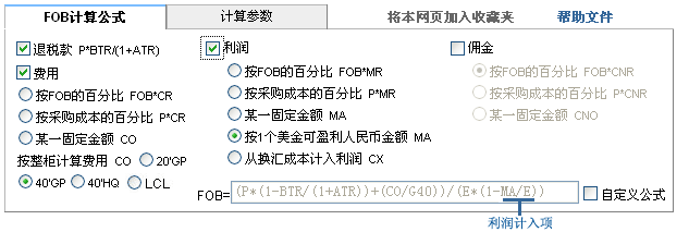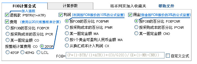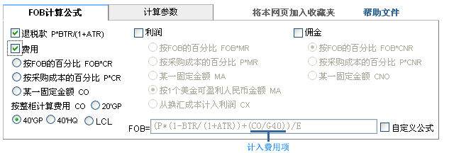首先,用户要确定自己的FOB计算公式包含哪些计入项,比如,是否有退税,是否有一个可估测的国内费用,利润要多大,是否有佣金或折扣等。 下面将图解介绍如何利用本网页构建自己的FOB计算公式。