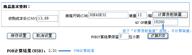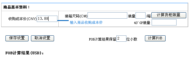 在图6所示的文本框中输入收购成本价, 如果不是整柜计算费用的话,按下“计算FOB按钮”,您将可以将商品的FOB价计算出来,如果是我们图4的计算公式整柜计算费用的话,您还要进一步确定指定货柜的单位商品装量。