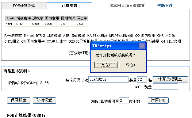 输入装箱尺码及装量之后,按下“计算货柜装量”,弹出如图7窗口,如果货物不允许侧放或躺放的话,请选择“否”,否则按“是”,则可计算出对应货柜装量。如图8,如果该装量计算结果同实际装量有偏差的话,您可直接输入装量。这样,按下“计算FOB”按钮就可以将FOB计算出来(图 8)。